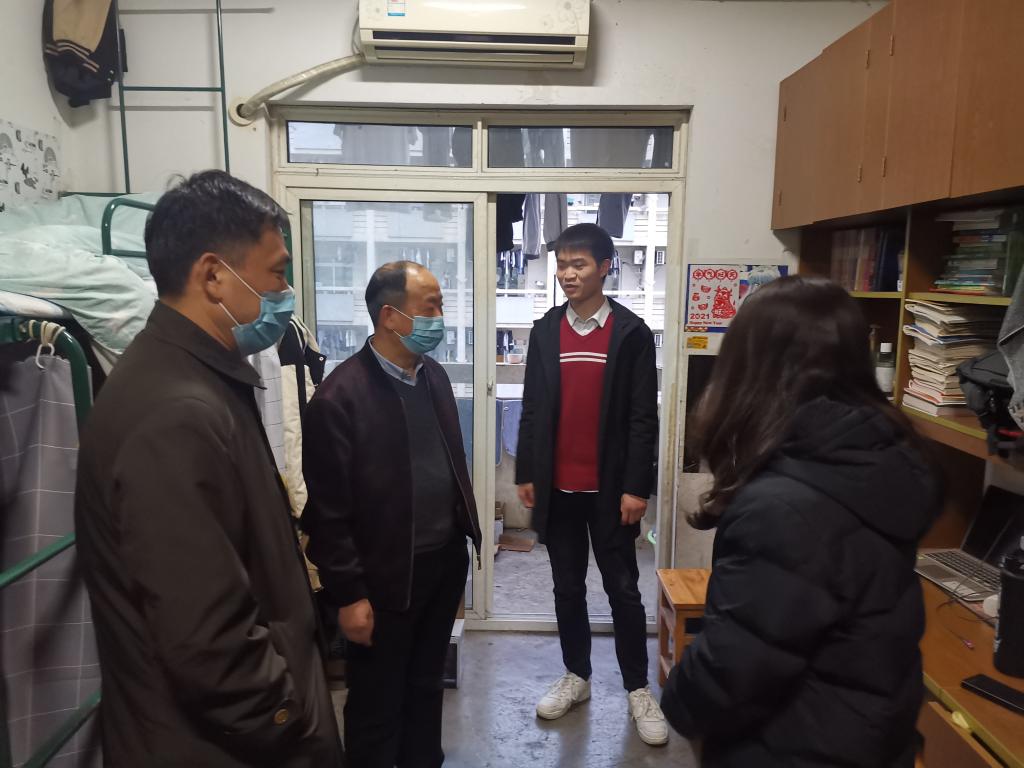 韦良德一行每到一个宿舍,耐心宣传校园疫情防控工作的相关要求,亲切询问学生近期各方面情况,了解学生学习生活中存在的困难,提醒学生做好个人防护,鼓舞学生“坚持就是胜利”。