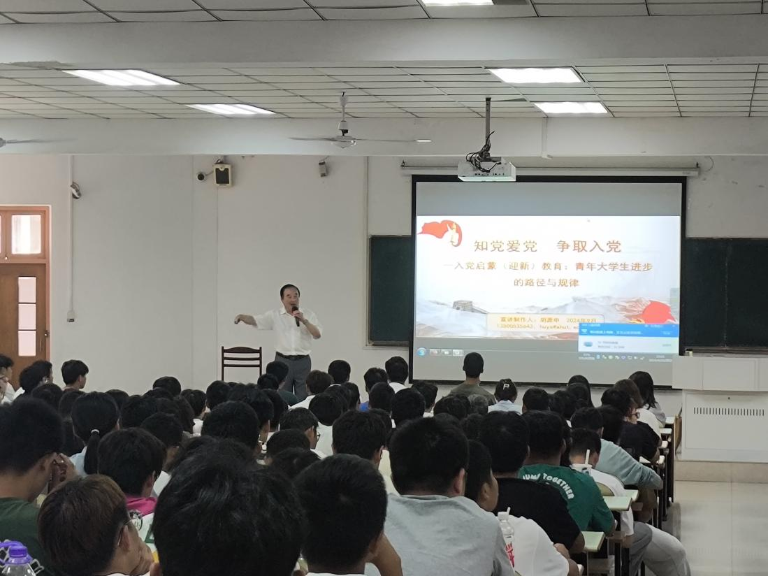 于佳山校区教三南103教室组织开展2024级新生入党启蒙教育专题讲座,校关工委副主任胡源申教授担任主讲人,2024级辅导员及全体新生参加了此次讲座。