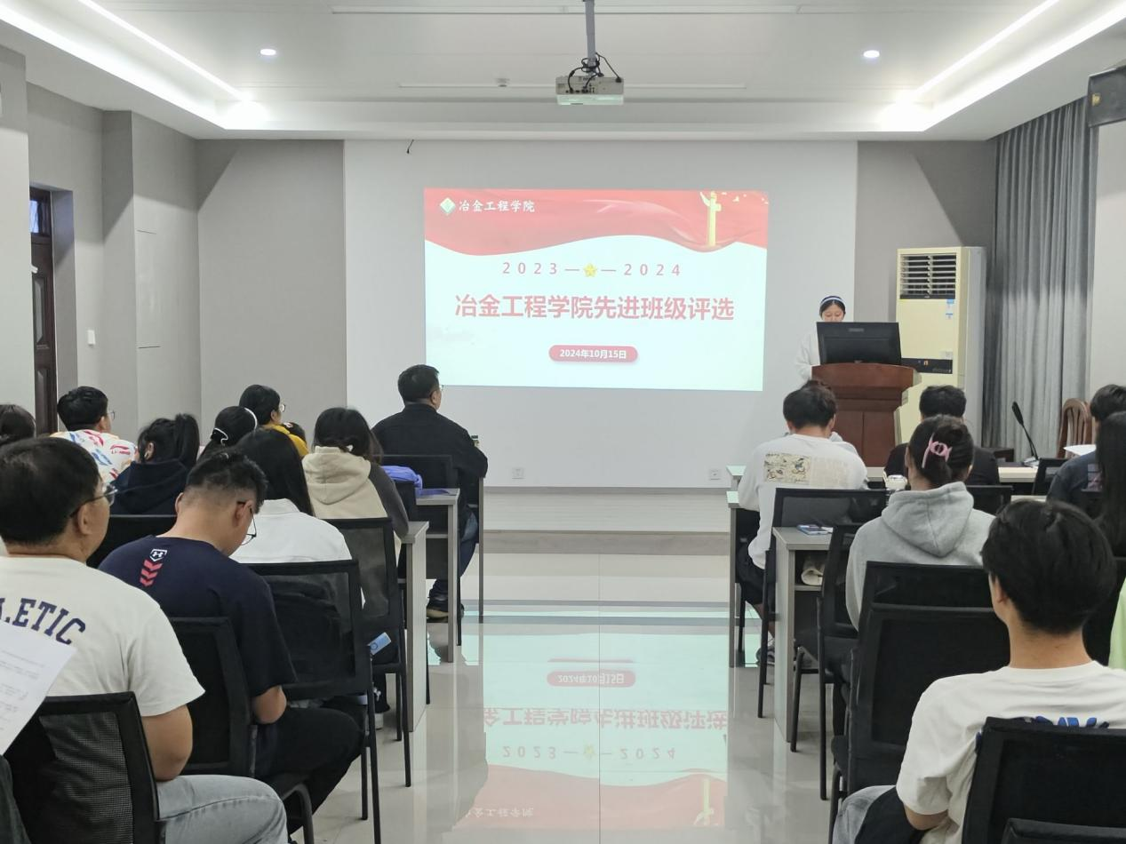 在冶金楼南302会议室举办2023-2024学年“先进班集体”评选会。院团委书记张夏,2021级辅导员朱志勇、李露露及学院各班级班干代表参加了会议。