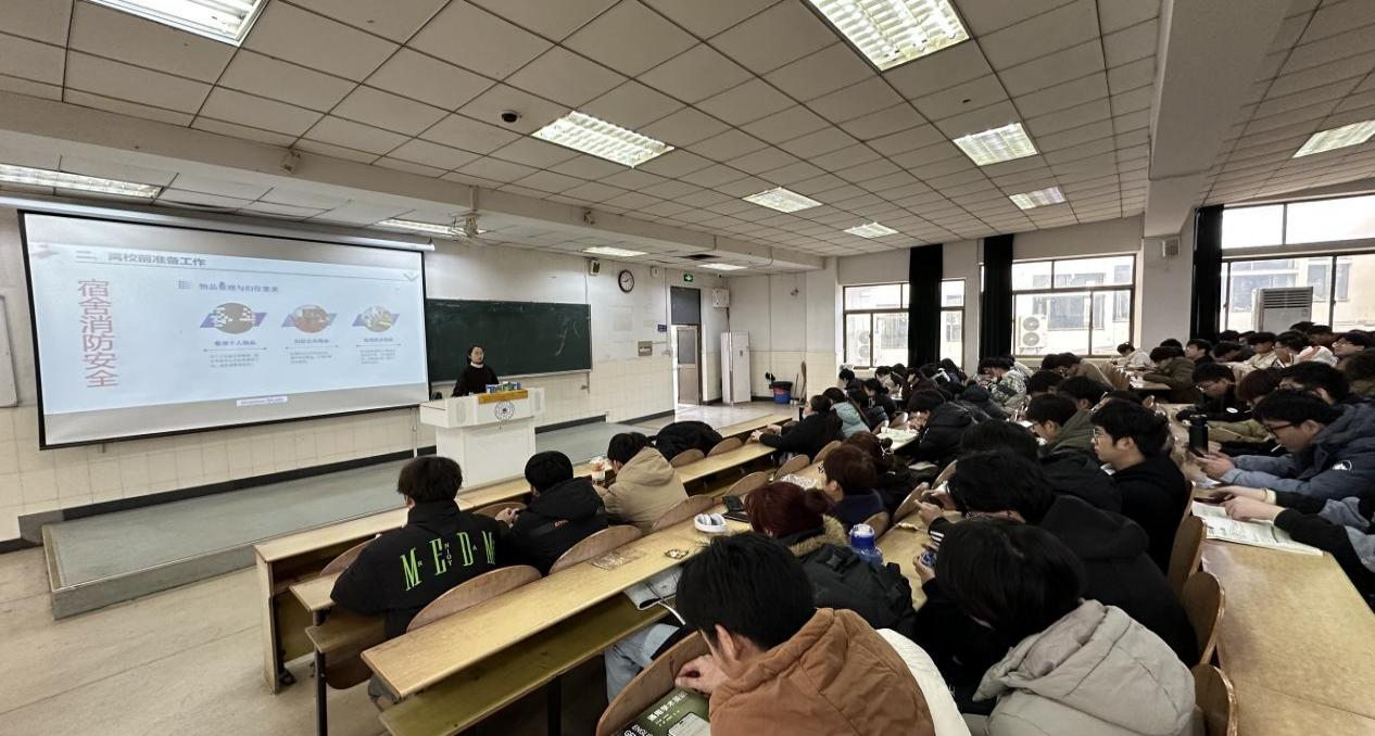 高倩莹围绕离校前准备工作、交通安全、防范电信诈骗、财产安全、人身安全、宿舍安全等方面,结合学生身边的案例,对学生进行了深入的安全教育。