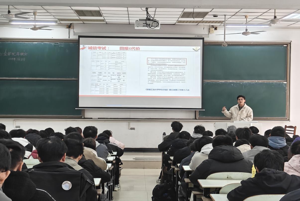 本次会议从文件解读、案例分析、签署承诺书三个方面展开,辅导员向全体学生解读了新修订的《安徽工业大学学生违纪处分办法》,并结合身边案例强调诚信考试的必要性及违反考场纪律可能带来的后果,最后动员全体学生签署诚信考试承诺书。