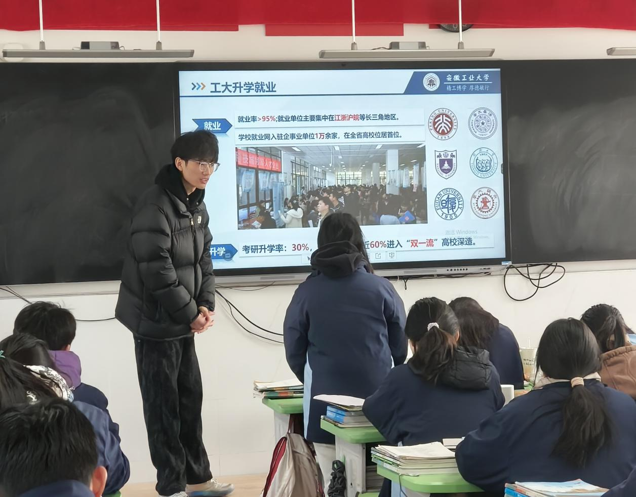 “我把工大带回家乡”百支爱校荣校实践团六安分队赴六安市第二中学进行宣讲。宣讲团成员杨庆乐同学以详实的数据和丰富的图片,全面介绍了安徽工业大学的教学资源和学术成果,用一场宣讲为学弟学妹们“种草”大学生活。