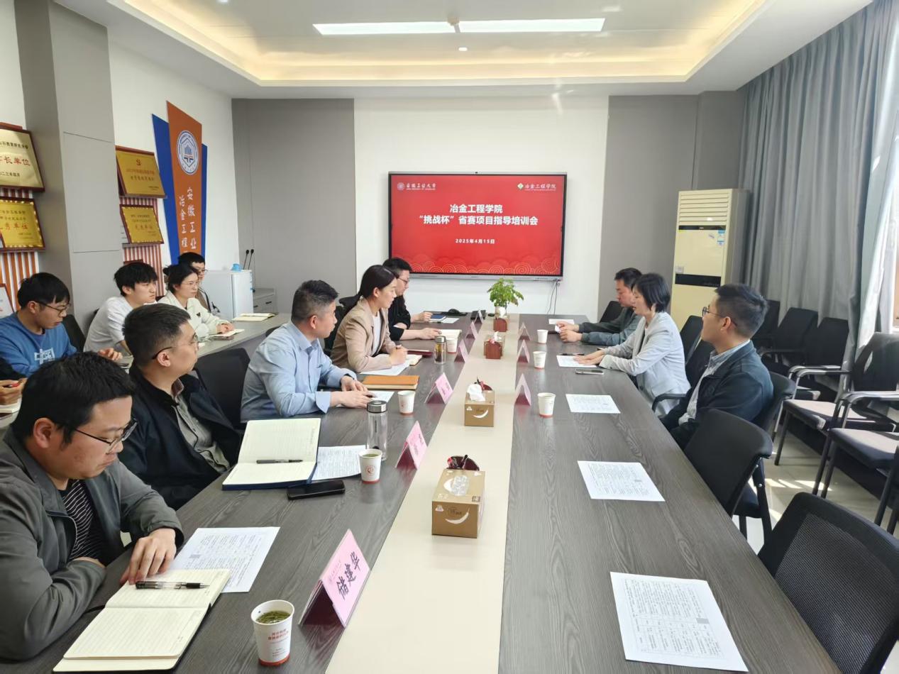 在冶金南楼324会议室举办“挑战杯”课外学术科技作品竞赛项目指导培训会。校团委书记赵颖虹,校团委兼职副书记丁守军,学院党委副书记、纪委书记、副院长朱艳飞,副院长岳强,校团委科技实践管理部部长滕少聪及学院获入围“挑战杯”省赛项目指导老师和团队成员参加了本次培训会。