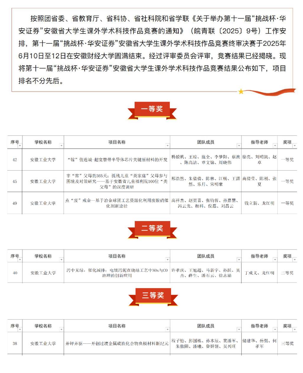 共有四个项目入围决赛,经过决赛激烈角逐,《点“废”成金基于冶金球团工艺资源化利用废脱硝催化剂新途径》《“镓”值连城-超宽禁带半导体芯片关键原材料的开发》和《非“常”父母的365天:孤残儿童“类家庭”父母参与困境及对策研究——基于安徽省儿童福利院100位“类父母”的深度调研》等三个项目斩获省赛一等奖,《污中见绿,催化减排:电镀污泥在烧结工艺中NOx与CO治理的创新应用》获省赛二等奖,创学院在“挑战杯”省赛中最好成绩。