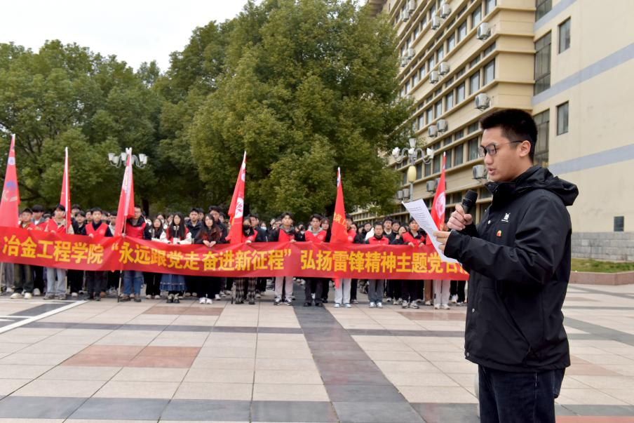学校国旗护卫队迈着铿锵步伐,将五星红旗护送至升旗台,庄严的国歌雄壮嘹亮,鲜红的国旗冉冉升起,在场全体师生肃立,唱国歌,行注目礼;安徽省“研究生创新创业之星”、冶金工程博士研究生党支部党员杨涛作《赓续雷锋精神,争做有为青年》演讲,通过分享自己的志愿服务经历和心得体会,勉励同学们做雷锋精神的忠实传承者、社会主义核心价值观的模范践行者。