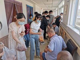 在敬老院负责人的带领下,同学们分成若干小组对老人们进行慰问。有的去往各个楼层的房间,陪老人拉拉家常、聊聊家乡,给老人带来欢笑和快乐;有的在给老人分发慰问品的过程中,倾听老人谈谈过去、讲讲当下,给老人带来慰藉和温暖;还有一部分志愿同学,对老人进行了采访和拍照记录,细心地询问老人的生活情况和娱乐情况,与他们进行心与心的交流。