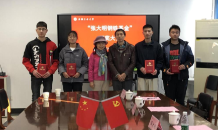 关于“张大明钢铁基金”奖教金、奖学金和助学金的通报》。张大明先生和朱洪斌女士共同为获奖师生和受资助学生进行颁奖。何世伟、许贝贝、鞠纳川分别作为获奖老师、获奖学生和受资助学生在会上发言。