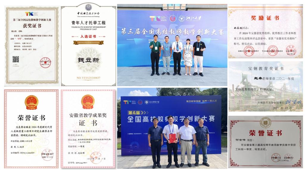 近年来教学团队引进具有丰富产业经验的“全国五一劳动奖章”获得者1人、国家科技领军人才1人,从事战略金属提取研究的青年博士20人。自主培养国家级教学名师、省研究生教学名师、省青年教学名师、省教坛新秀等10人次;获宝钢优秀教师奖、省优秀教师、省级教学成果一等奖等荣誉及奖励20余项。团队教师主持国家级和省级各类重大、重点教学研究项目5项,国家级一流课程2门、省级课程13门;获全国高校教师教学创新大赛一等奖、三等奖各1项,安徽省高校青年教师教学竞赛一等奖1项(图9)。