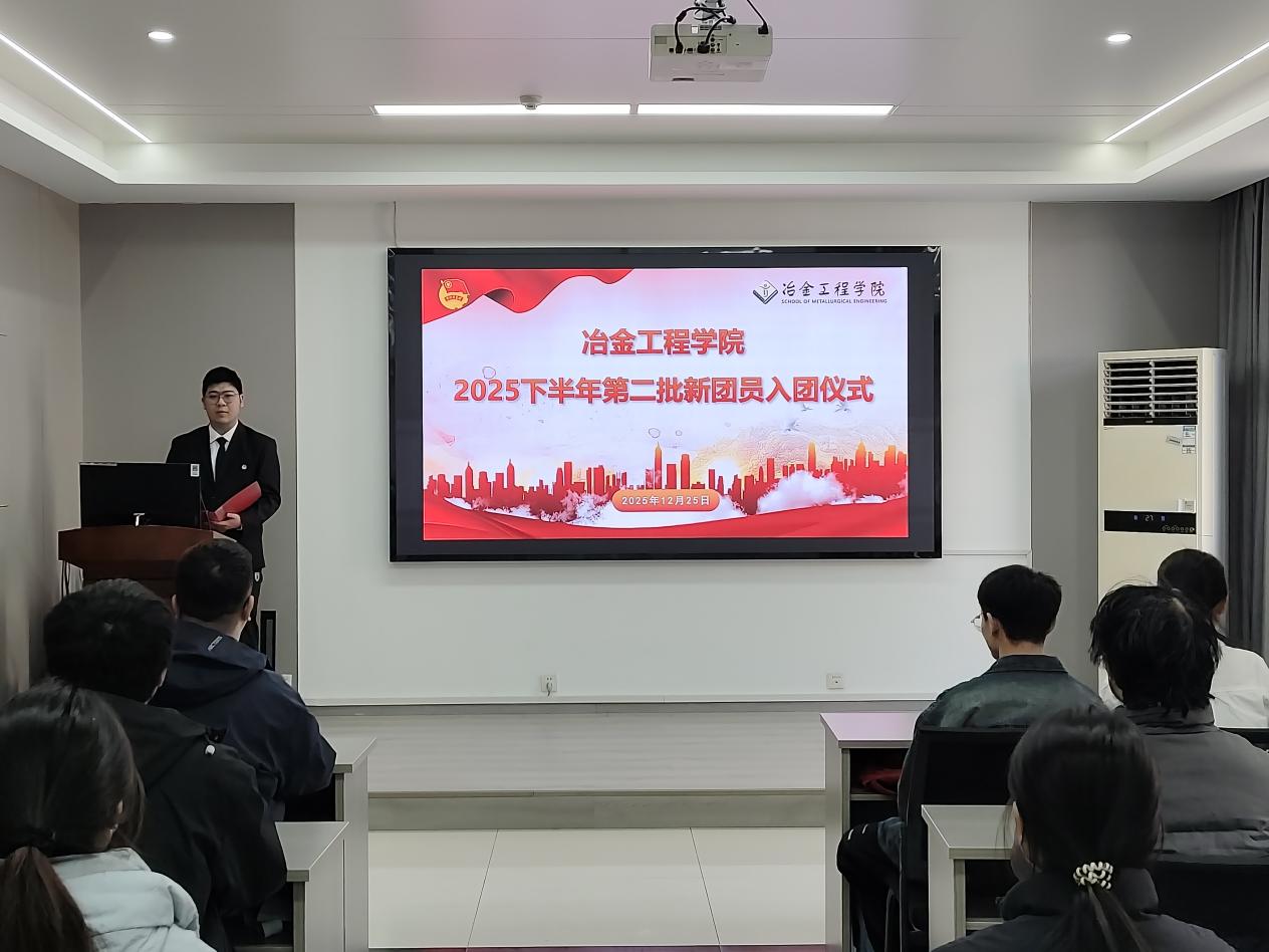 在冶金楼南302教室举行2025年下半年第二批次新团员入团宣誓仪式。院团委书记张夏、学院优秀团员代表、新发展团员共计40余人参加仪式。