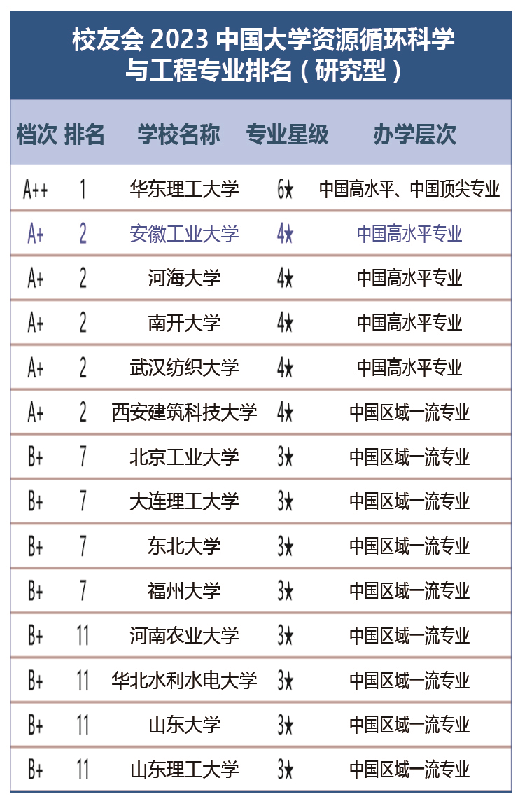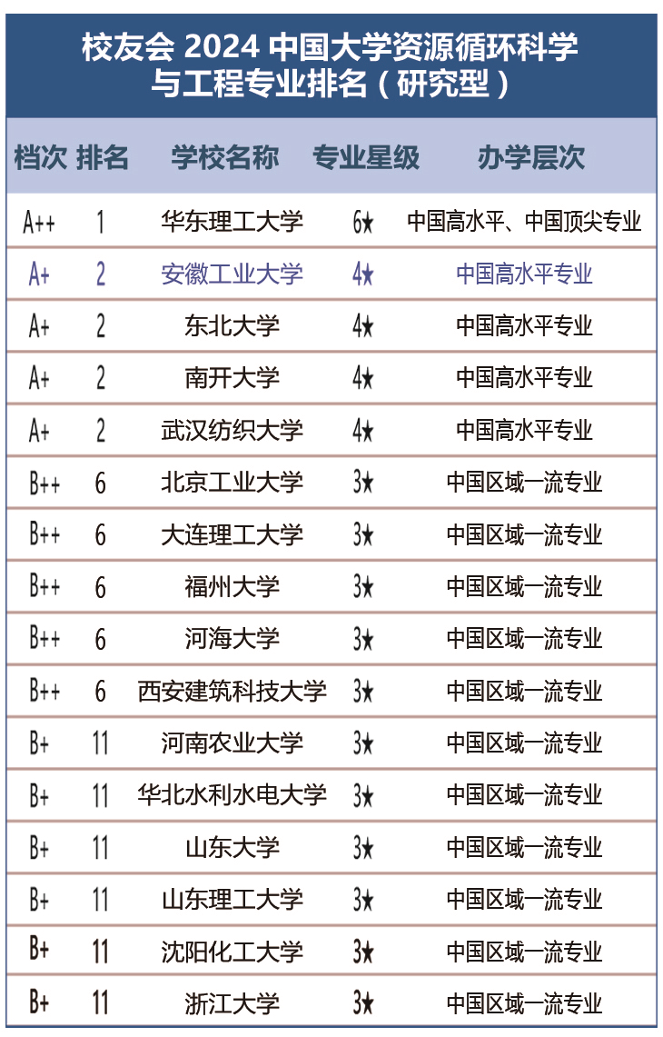近期,在全国第三方大学评价机构艾瑞深校友会网正式公布的《2024校友会中国大学排名:高考志愿填报指南》中,我院资源循环科学与工程专业位居A+档次,连续两年排名全国第二。