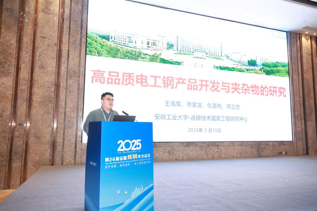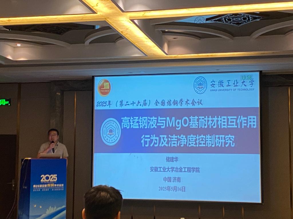 常立忠教授、夏云进教授、王海军副教授、张超杰副教授、从俊强博士和储建华博士等一行6人受邀参加此次学术盛会。王海军副教授作了题为“高品质电工钢产品开发与夹杂物的研究”的大会报告,储建华博士作了题为“高锰钢液与MgO基耐材相互作用行为及洁净度控制研究”分会场报告,详细介绍了在无取向硅钢和高强塑性高锰钢领域的最新研究进展,研究成果引发现场广泛讨论和深度交流,获得与会专家高度评价,提升了我校在高端钢种开发领域的学术影响力。