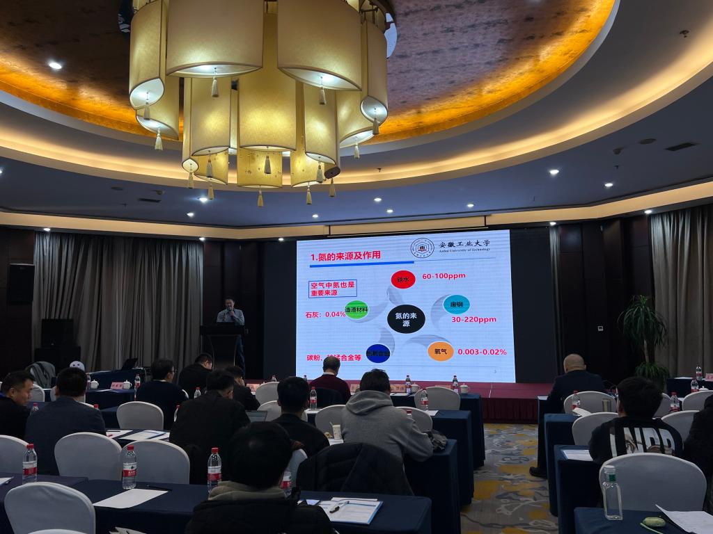 在炼钢领域的专业实力与学术影响力。在论坛中,夏云进教授作了题为《转炉炼钢过程氮的控制与预测》的邀请报告。该报告聚焦转炉炼钢过程中的氮元素,深入分析其在炼钢工艺中的行为与变化规律,并创新性的提出了控制策略和预测模型。相关研究成果对优化转炉炼钢工艺、提高钢产品质量具有重要的理论与实践指导意义,引发了与会专家学者的热烈讨论与深入交流。