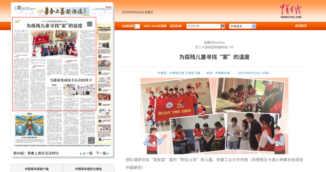 2025年9月26日,《中国青年报》在其纸质报纸第04版以《安工大调研团跨越两省八市为孤残儿童寻找“家”的温度》为题刊发对ACG社区