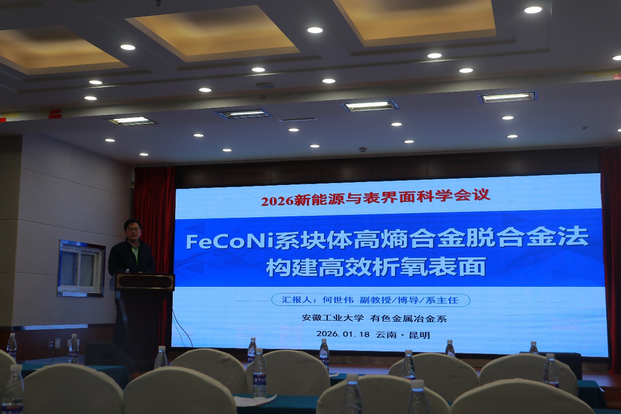 会议汇集了来自国内外知名高校及研究机构的专家学者,围绕界面电化学、电极材料、新能源固废回收等前沿领域展开了深入研讨。何世伟副教授以《FeCoNi系块体高熵合金脱合金法构建高效析氧表面》为题,介绍了团队在高熵合金表面电化学改性、低共熔溶剂(DES)脱合金技术以及析氢催化电极制备方面的最新研究进展。