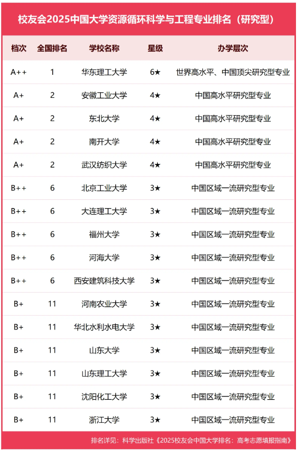 近期,在全国第三方大学评价机构艾瑞深校友会网正式公布的《2025校友会中国大学排名:高考志愿填报指南》中,我资源循环科学与工程专业位居A+档次,连续三年排名全国第二